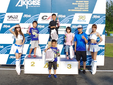 レース体験を目的に設定された、大治郎カップのエントリークラス、バンビーノクラスには5台がエントリー、No,7須藤富士央選手が好走、序盤よりリードを築いてトップでゴール、2位にNo,12河合龍之介、3位にはNo,14河合美憂選手が入賞した。