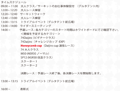 2012年よりサーキット秋ヶ瀬でのイベント「チャレンジカップ」内のカテゴリーとして74Daijiroの新しいレース「Honeycomb CUP(ハニカムカップ)」