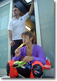 シーズン中盤のヨーロッパラウンドは雨に翻弄されたレースが多く、不安定なコースコンディションと不慣れなサーキットへの適応が目下のところ、大治郎の課題とされている。しかし、各国のチャンピオンが集まり、世界一を競い合うWGPにおいて経験というアドバンテージは勝つ要素として大きなウエイトを占める。限界を極めるロードレース競技の世界は奥深かい。 8月18日チェコGP公式予選1日目。「今日は快晴。気温が高く、かなりタイヤには辛いコンディションながらチェコGPはドライでのレースが期待出来そうですよ。」と電話の向こうで、SHOEIのグランプリ担当・山下さんは答えてくれた。少なくともドライコンディションで走れる事に内心ホッとする。長いグランプリ生活を考えても、そのサーキットでのベストコンディションを体験する事の意味は計り知れない。大治郎のGP参戦は始まったばかりなのだから…。 8耐優勝の余勢を駆って、調子良く予選にチャレンジしたいところだったが、そんなに甘くはなかった。ライバルであるポイントリーダー O.ジャックや中野真矢、先輩宇川 徹が着実に予選上位を占める中、大治郎は出遅れる。ここ数戦、アプリリアにも勢いが見られM.メランドリもトップ争いに加わって来た。陸続きのヨーロッパでの戦いに入って、ヨーロッパのライダー達が勢いづくのは経験値の差だろう。16番手は大治郎にとってもチームにとっても苦しい順位で、まだ限界アタックするまでコースを攻めれる状況に無い事を表わしていた。 8月19日予選2日目、午前のフリー走行では自己タイムを着実に縮めるライディングを見せて、残った予選への感触を良いものに感じさせた。しかし、上位ライバル達とのタイム差は縮まりこそしているもののレースで戦える程には迫れない。試行錯誤のセットアップも思うようなバランスがとれず、8番グリッド2列目からのスタートとなる。 「まだベストライディングには程遠く、よく分からない。」と語る大治郎。前半戦から好調を維持するYAMAHAの2台に宇川が肉迫。アプリリアのメランドリ、ワルドマンが続いて混戦の様相を呈している。この優勝争いに加わりたいところだが、厳しいタイム差がチームAXO・HONDA・GRESINIのピットにもプレッシャーをかける。初参戦の壁。誰もが受ける洗礼とは云え、大治郎にとって苦渋の時間に他ならない。 シーズンも後半に入り、チャンピオンシップ争い上位選手達は取りこぼしが許されない中での戦いとなっていて、転倒によるノーポイントや怪我での影響を考えてレースに臨まなくてはならない。その事が本来持ち得るライディングの領域を狭める結果となる。ましてや初めてのサーキットなら尚更の事。こうしたグランプリならではの重圧と精神的な戦いを積み重ねて前へ進むしかないのである。 序盤戦の戦い振りから、表彰台を逃してしまったここ数戦の大治郎を不調と評す間違いを耳にするが、歴代GPライダーでルーキーイヤーに初サーキットでコンスタントにポイントを逃さず走りきっている選手が何人いるだろう?置かれた状況でのベストを尽くしている。しかし、結果に結びつかないレースもある。あの偉大な世界チャンピオンM・ドゥーハンが評するとおり、大治郎には非凡なライダーとしての才能があり、それは世界で通用するものである事は疑いようのないのもだが、不足している経験も多分にある事は否めない。 大治郎自身、「勝つために参戦している。」と語るとおり、常に全力でチャレンジしている。その結果が優勝や表彰台であったり、そうでなかったり…。 決勝レースでは、スタートこそ順位を上げて1コーナーに飛び込んだもののペースを上げる事が出来ない我慢のレースとなってしまう。6番手というポジションをキープし切りチェッカーを受ける。セッション毎にタイムを詰めて、ポジションも上げての結果でポイントも獲得。長いシリーズや将来のグランプリ生活を考えた時に大切なレースをひとつ終えた。そうチームは判断している。獲得したポイントが次に繋がることを元GP125世界チャンピオンであるグレッシーニ監督は理解している。 レース終了後、大治郎は多くを語らなかった。「ペースが上げられなかった。」との僅かなコメントに想いが集約されている。次はポルトガルGP、大治郎のチャレンジは続く。 |